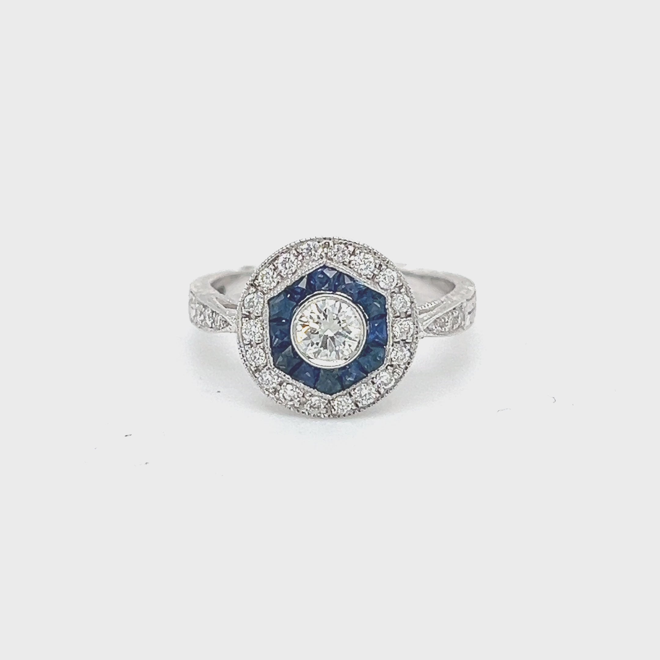 Sapphire & Diamond Deco Style Round Cluster Ring 18ct White Gold